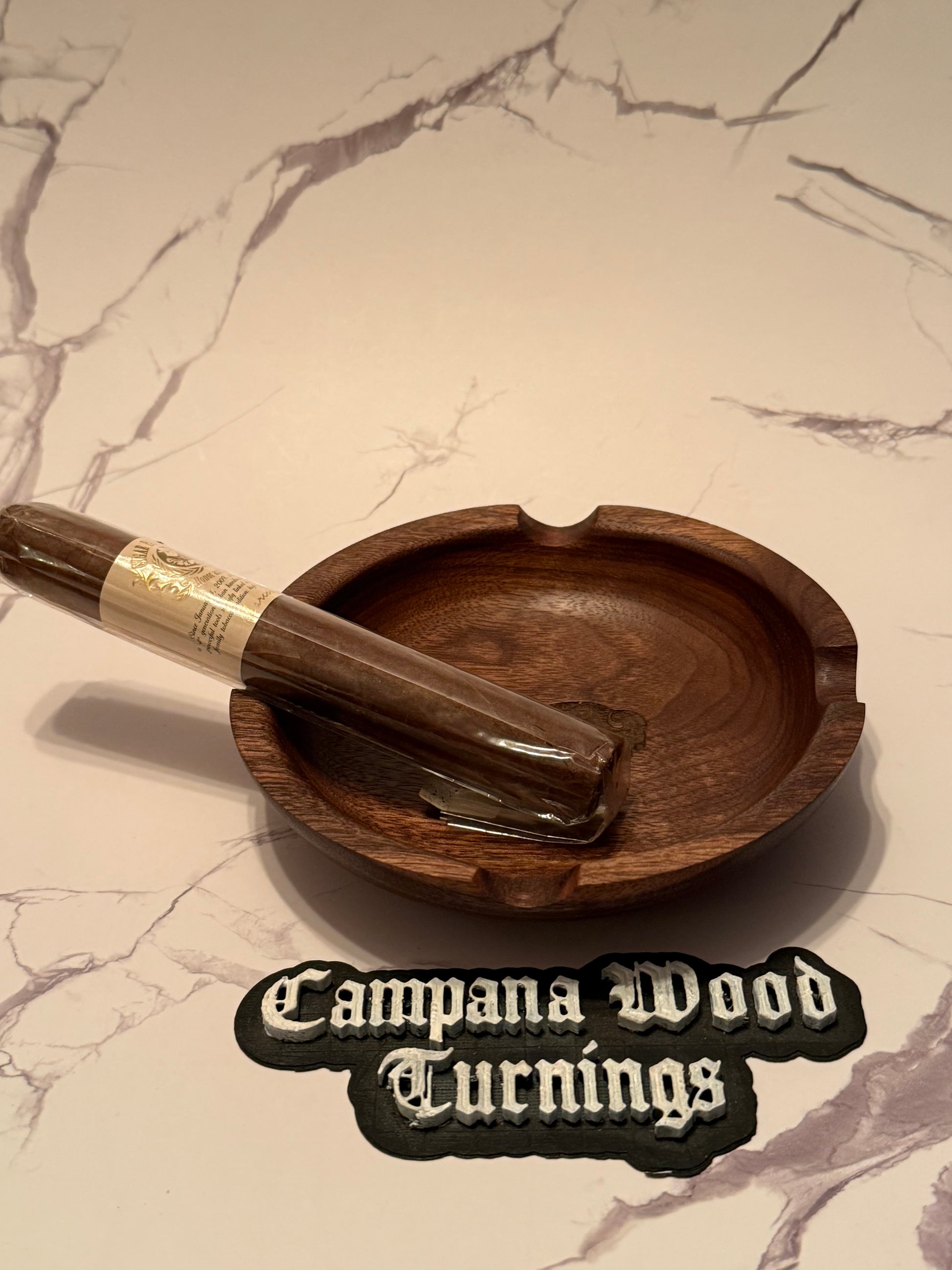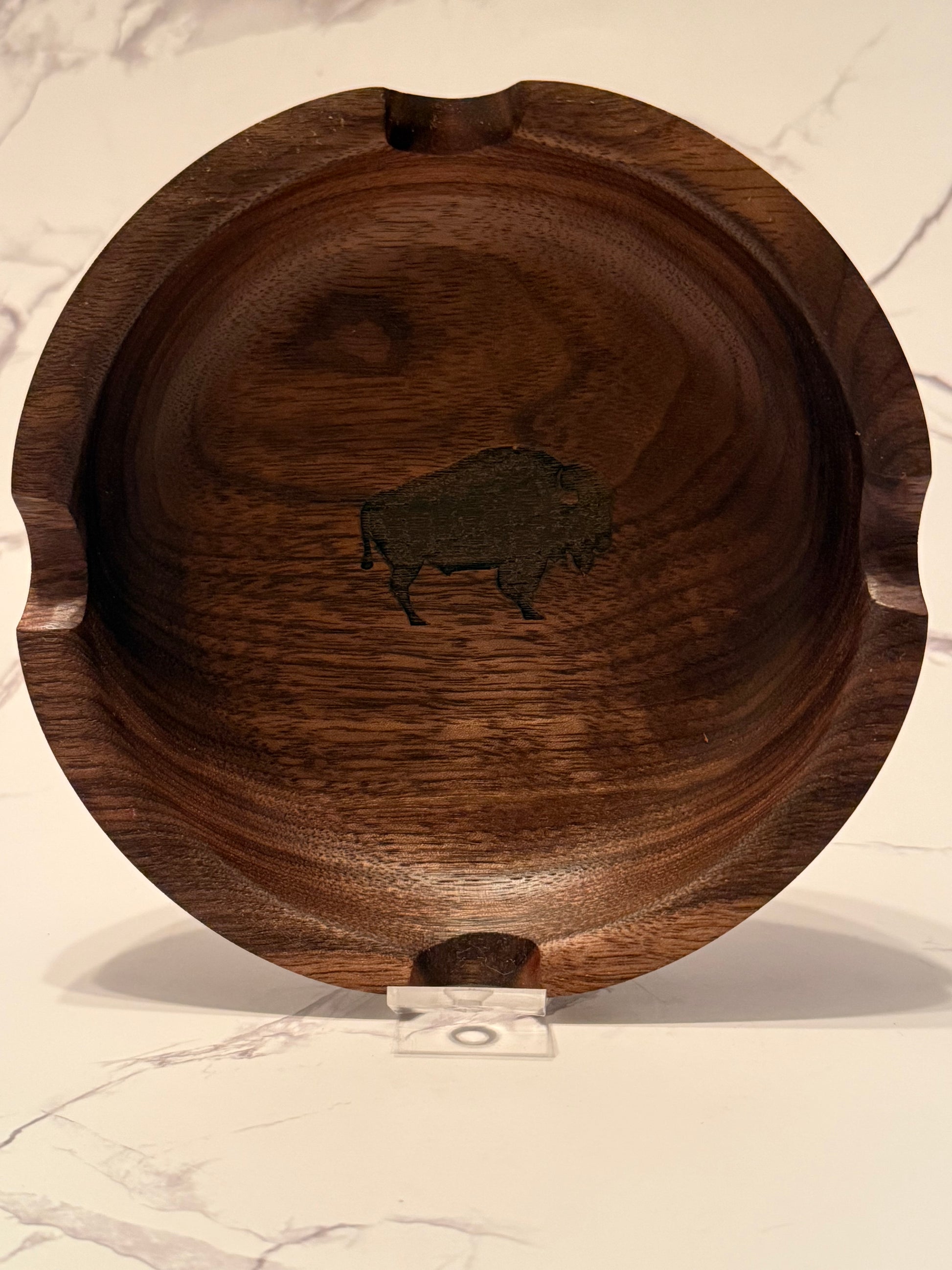 Handcrafted from rich black walnut, this turned ash tray features a striking laser-engraved buffalo centerpiece—a distinguished accent for any cigar enthusiast's collection. The natural grain of the wood complements the detailed wildlife imagery, creating a functional piece that commands attention on desk or table. Perfect for the discerning smoker who appreciates quality craftsmanship and meaningful design details.