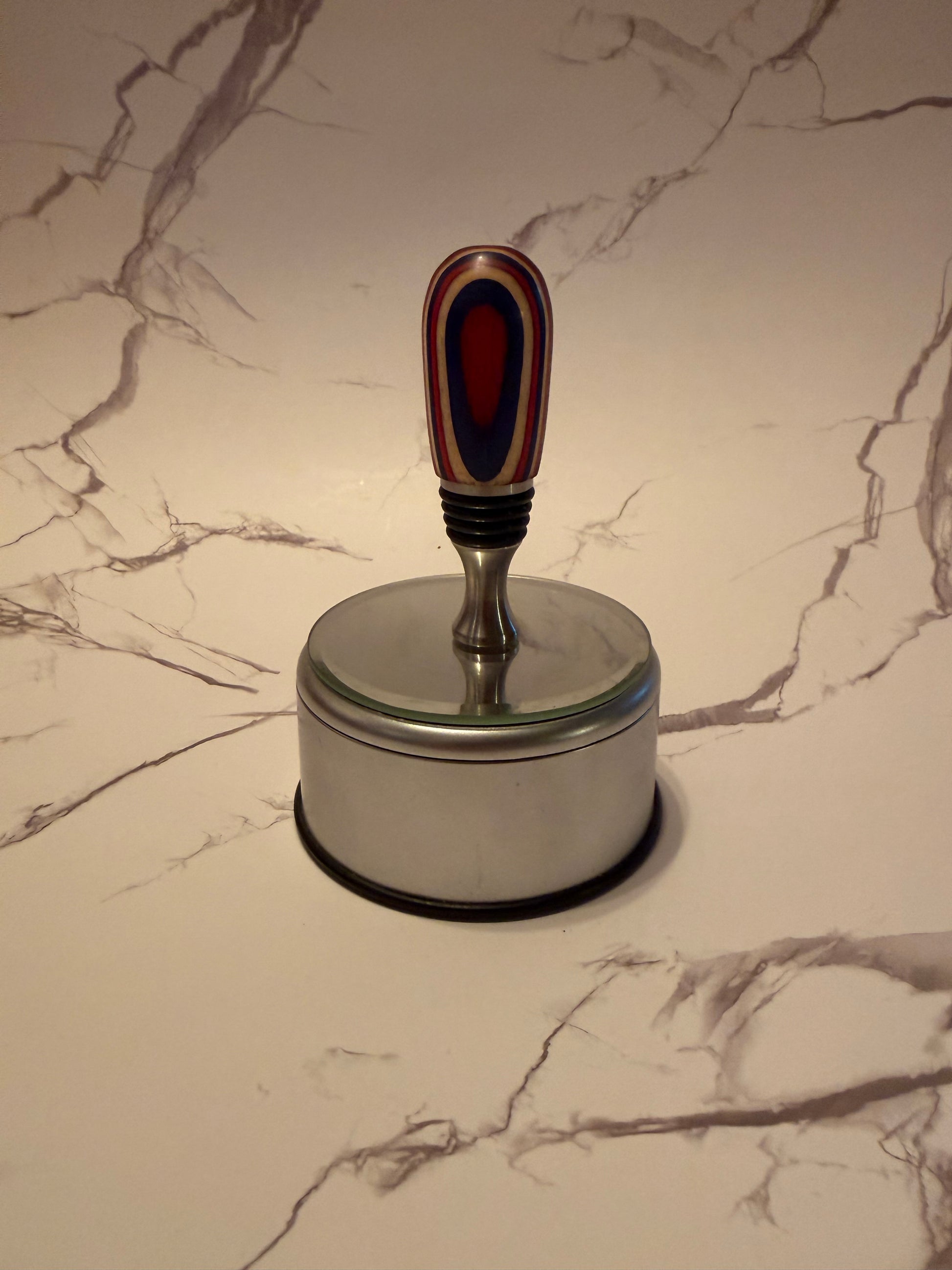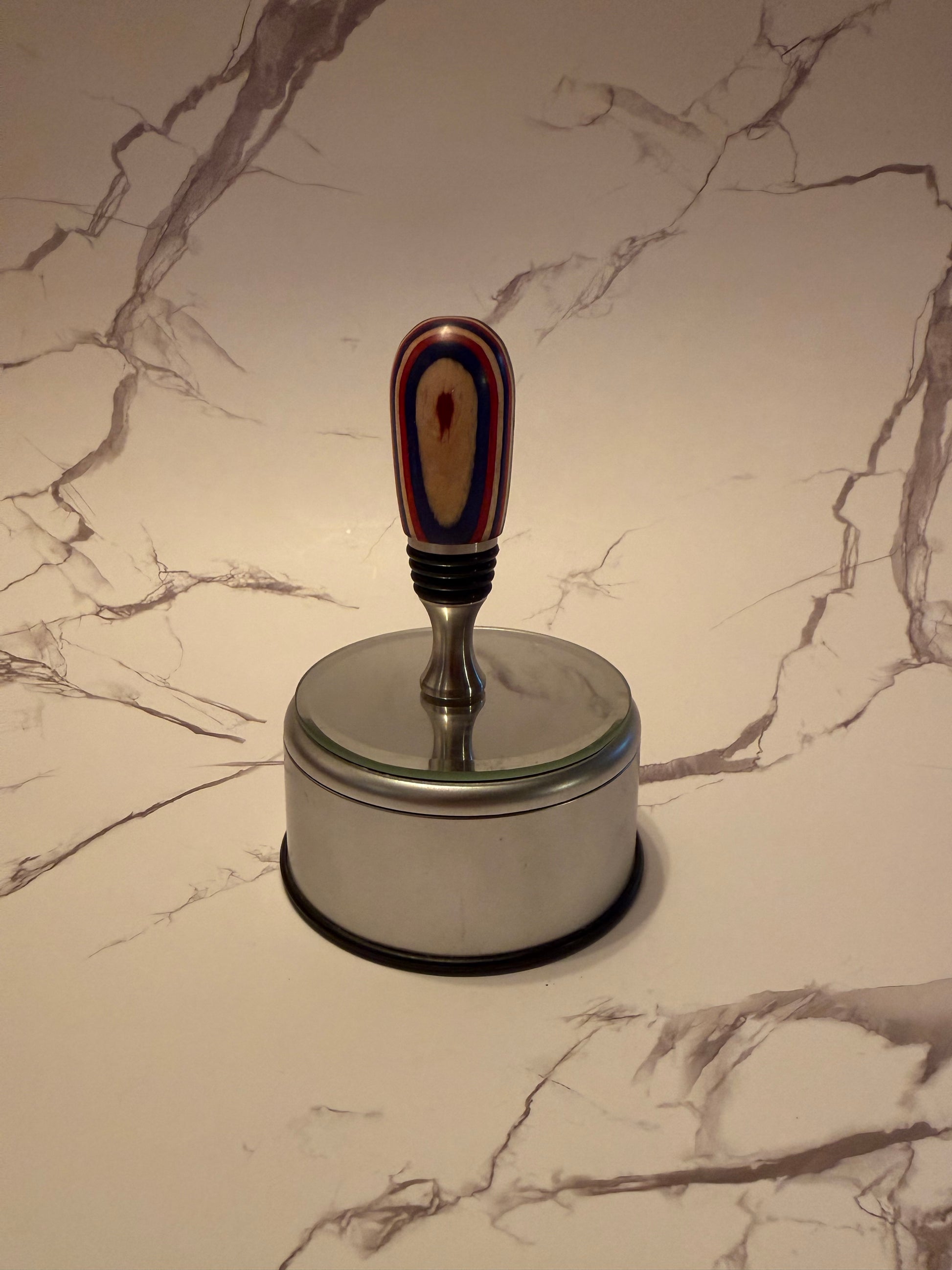 This artisan bottle stopper combines food-grade stainless steel construction with a hand-turned wood top featuring striking red, white, and blue laminated wood. Manufactured in the USA, it delivers reliable performance and lasting durability. The precision-crafted stainless steel shaft ensures a secure seal, while the custom wood turning showcases meticulous attention to detail and traditional woodworking expertise. An ideal choice for wine enthusiasts who appreciate quality craftsmanship.