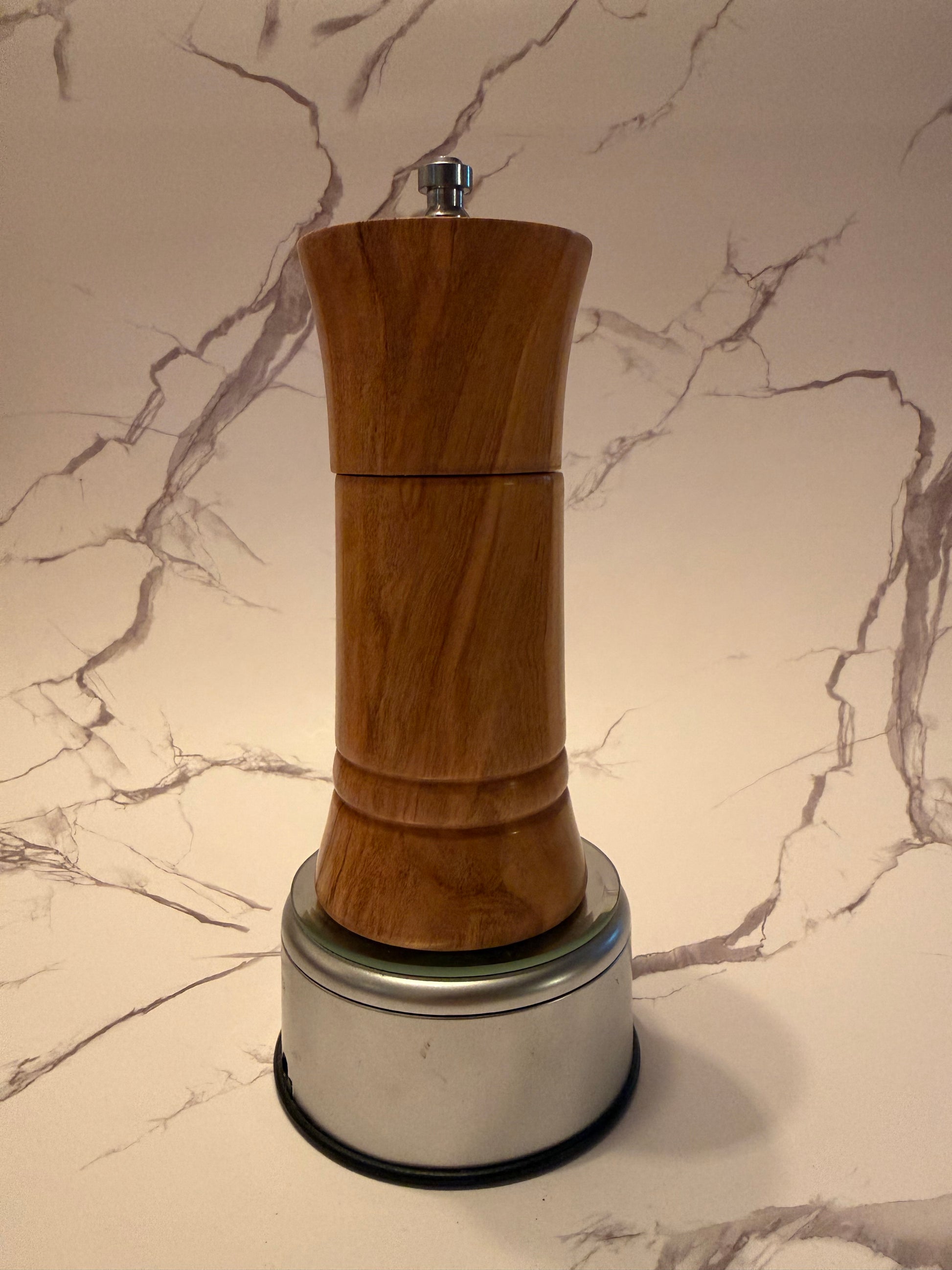 Handcrafted from cherry wood, this dual-function salt shaker and pepper mill combines artisanal woodturning with everyday utility. Each piece is individually turned on the lathe, showcasing the natural grain and warm tones distinctive to cherry. The shaker dispenses salt with controlled precision, while the integrated mill grinds fresh peppercorns on demand. A refined addition to any kitchen, this combination tool reflects the craftsmanship and attention to detail that defines quality woodwork.